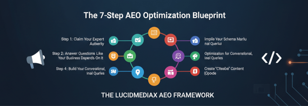 You can implement basic AEO practices yourself (creating FAQs, adding expertise statements, writing Q&A content). However, technical elements like schema markup, comprehensive E-E-A-T optimization, and strategic content planning typically require professional expertise. Most successful businesses work with agencies like LucidMediax to implement a complete AEO strategy.