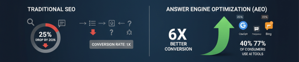 Not in the near future, but the shift is happening. Gartner predicts a 25% decline in traditional search traffic by 2026. Smart businesses invest in both traditional SEO and AEO now to future-proof their digital presence. Think of AEO as evolution, not replacement.